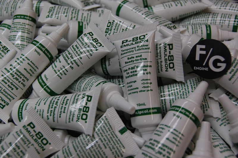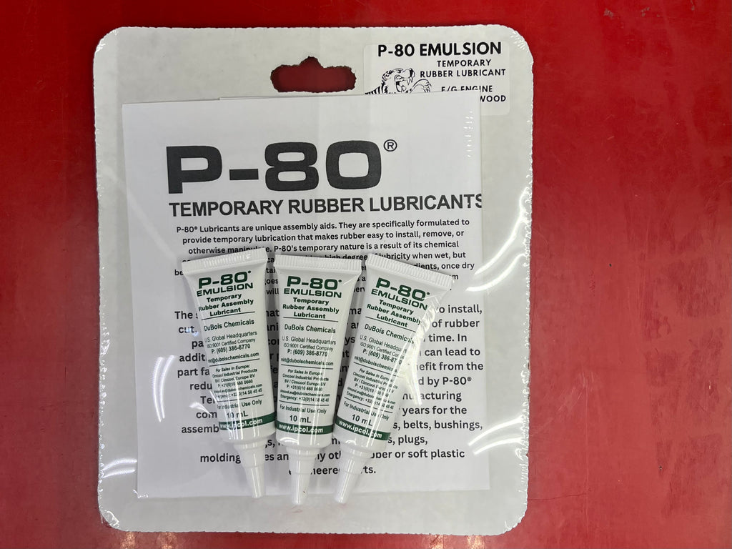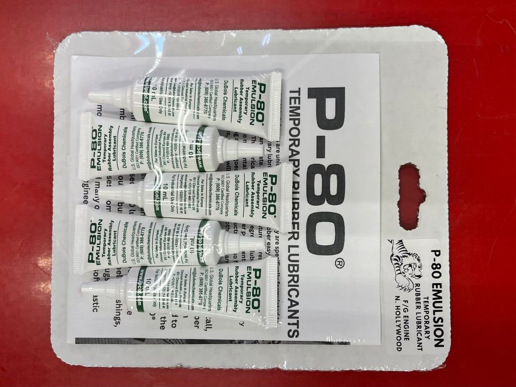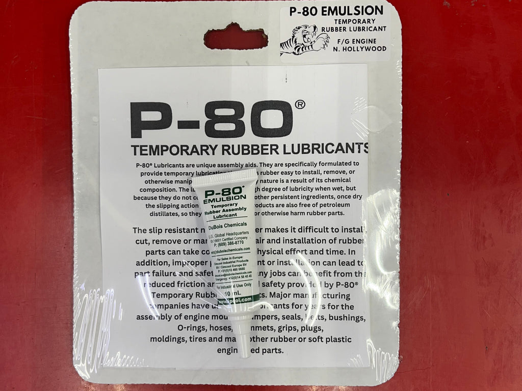 P-80 Emulsion is a temporary rubber lubricant that will reduce the friction of rubber by 70%. After installation it will dry with no residue, and will not reactivate. It is extremely helpful in installing O Rings, oil seals, hoses, grommets, hand grips, and more. Anyone who does not have this in their tool box is missing out.